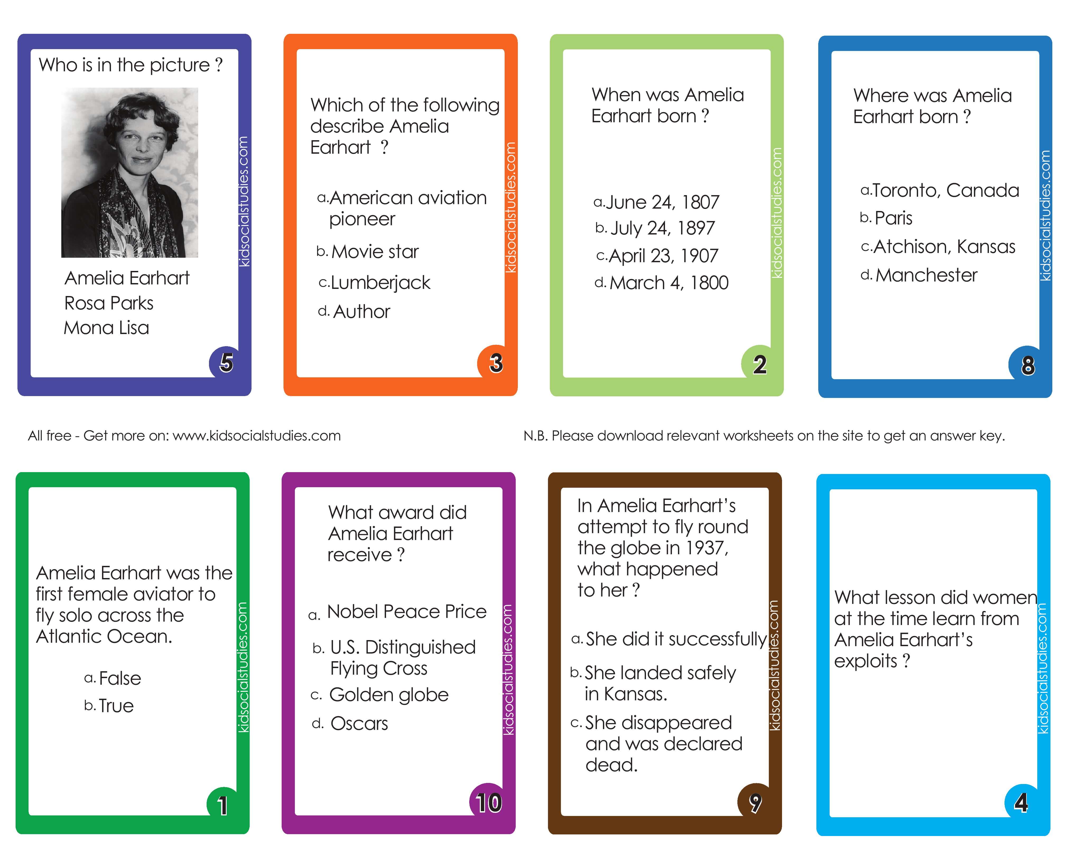 Amelia Earhart Flash Cards PDF. Use these flash cards to teach students about some facts related to Amelia Earhart. She was the first female pilot to pioneer a solo flight across the Atlantic Ocean. Print from the link below.